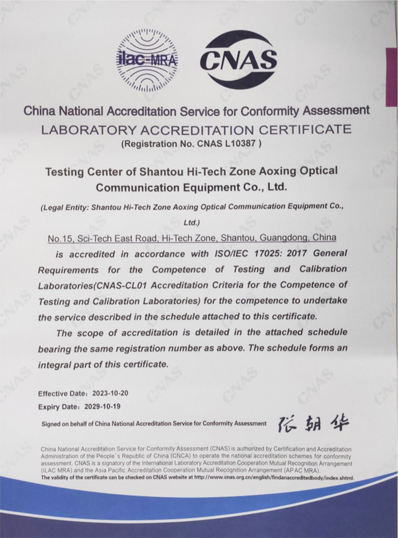 汕頭高新區(qū)奧星光通信設(shè)備有限公司檢測(cè)中心成立于2000年,設(shè)有光纖光纜產(chǎn)品及其原材料檢驗(yàn)的理化性能實(shí)驗(yàn)室、機(jī)械性能實(shí)驗(yàn)室、光學(xué)性能實(shí)驗(yàn)室和電氣性能實(shí)驗(yàn)室。